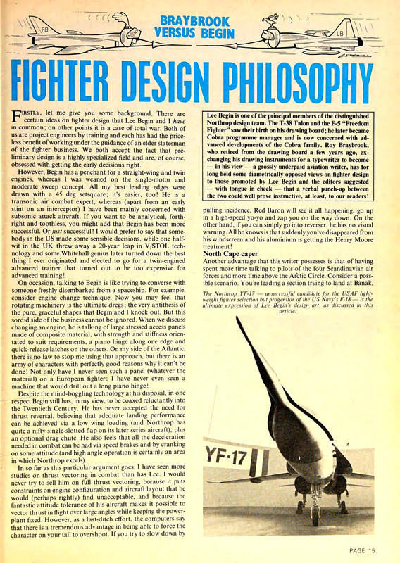 A copy of a very interesting article on the Northrup F-5 & YF-17 Fighter Design Philosophy. From the Air International magazine, Vol.10 of January 1976.